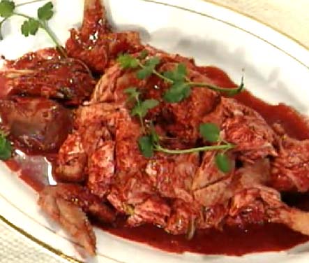 2、将晾冷的鸡身切成四块,留下鸡脚,鸡头劈开成二片,翅膀均切成两段,然后一并放进小盆里,加入味精3克、精盐0、5克、高梁酒调匀,密封腌渍一小时后,放盖,将鸡翻面,再加入味精4、5克、精盐5克、白糖35克、炳汁、五香粉、绍酒、搅匀,密封再腌一小时后取出。并将鸡块切成0、8厘米长、0、4厘米宽的柳条片,排在盘中,拼上头,脚、翅膀成全鸡形。