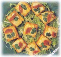 (3)将面包四边沾上蛋液置碟上,并放入火腿及1小片芫茜叶。