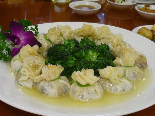 4、将石榴球放在蒸箱里旺汽加热约5分钟,摆入盘中,边上以焯水后的西兰花围边,浇上生粉勾的芡汁、淋香油即可。