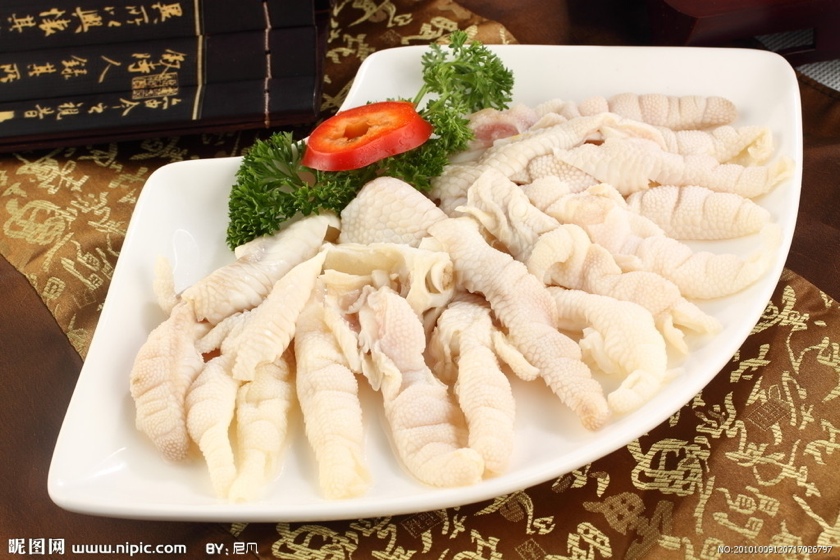 主料:公鸡脚爪500克。红油20克,蒜泥10克,椒盐10克。