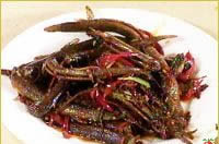 2、坐锅点火放油,油6―7成热时放入泥鳅炸至外表起脆壳捞出沥油;