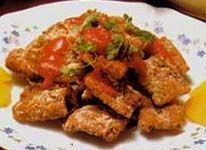 主料:鳝鱼段500克,面粉50克,生粉50克,盐少许,酱油两大匙,麻油适量,味精少许,料酒1匙蕃茄酱2大匙,葱少许,糖适量,盐少许。