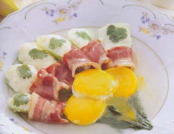 3、青菜洗净,均匀放入适量馅料,涂上一层豆腐糊,分别用一片五花肉卷起来,放上蛋黄,移入蒸锅中,以小火蒸7-8分钟,即可端出。