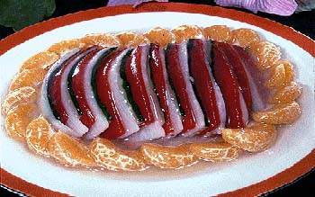 2、油纸抹上芝麻油,平铺汤盘内,将山药片和京糕片颜色相错地摆成几行,码成房脊形,每行中间用青梅依次反方向顺摆成绿瓦状。
