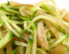 8.食用时,将萝卜条摆在下边,黄瓜条摆在上边呈桥形,点缀上辣椒丝、姜丝即可。