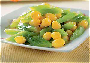 2.炒锅上火入油,放白果、苦瓜及调味料炒熟。