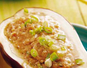 3.用大汤碗盛上茄子,茄口朝上,加入调好口味的汤汁,上屉蒸熟,取出时滗出汤汁将茄子开口处朝下扣在盘中;炒锅上火,加入滗出的汤汁,调好口味,加少许淀粉勾成米汤芡,浇在茄子上,撒上蒜末即可。