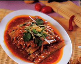 (4)勺内放底油,烧热后放葱,姜,蒜,尖椒丝,胡萝卜丝,再放炸好的茄条,香菜,速倒入对好的汁,颠翻几下,装盘即好。