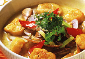 盒装豆腐100克,土芹25克,鲜花甲肉(即蛤蜊肉)150克,鲜番茄1个(重约30克)。调料二汤500克,姜片15克,番茄酱25克,牛油10克,盐5克。