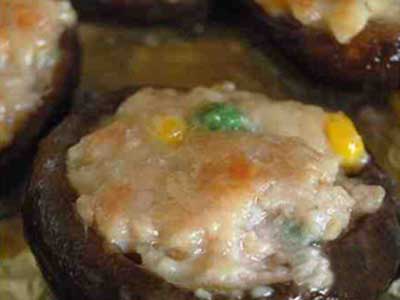 2、将冬菇内侧撇上干淀粉,一半冬菇抹上肉馅,扣上另一半冬菇,成冬菇盒。