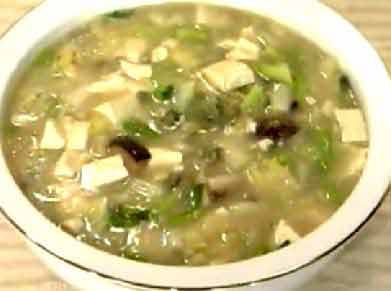 8.锅置旺火上,下适量花生油,取几个大蒜白煸一下,出香味时倒入肉丝、香菇、冬笋炒几下,下清汤150毫升、豆腐块(用勺捣碎)烧沸几分钟;