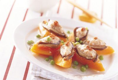 4.木瓜上放肉馅,放上1粒枸杞,用香菇围边,入笼蒸8分钟。