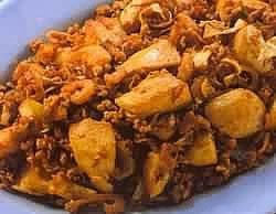 2、烧热3汤匙油,先爆炒绞肉并放入姜茸及虾米(切碎)、榨菜(切碎)同炒,炒至香味透出后,淋下酱油并将笋条落锅,加入盐及糖调味,再用大火煸炒至干,最后下葱茸与香油即可。