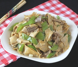 干豆腐(豆腐皮)两张,尖椒两根,猪里脊肉200克,花椒两三粒,蒜两瓣,盐少许,鸡精少许,水淀粉适量