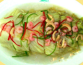 2.勺内放猪油,用葱、姜块炸锅,添肉清汤150克,放调料,下虾米、白菜条,然后取出葱、姜块,煨四分钟,用湿淀粉10克(淀粉5克加水)勾芡,淋香油,翻勺拖入盘内即成。