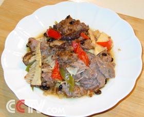 3、将香菇、冬笋、柿子椒和炒好的豆豉汁一起倒入牛肉中上屉蒸10分钟即成。
