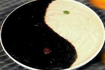 4、下入豆沙、猪油搅匀,炒成稠糊,与蒸好的芋泥分别舀入盘内,构成太极图案,分别放上一粒红樱桃即成。
