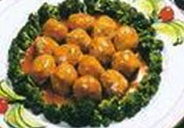 三、用盘子一只,盘底抹上一层薄油,以防黏底。然后将做好的丸子排在盘中,上笼用旺火蒸熟(约五分钟),取出,用少许热汤冲一冲,使丸子不致过于干燥。