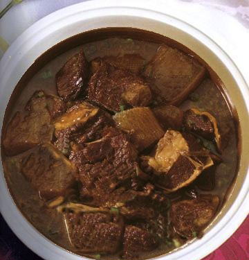 5、锅中剩余的牛筋再用小火多焖一个小时至软嫩,回锅牛腩,放白萝卜、炸豆腐、紅辣椒,再放些盐、糖、味精调味,转大火煮至收汁变稠,下腐竹与葱头,再煮十分钟洒点胡椒粉即可出菜。