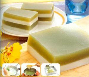 2、将材料(3)中的抹茶粉用少许冷水调拌开来,再与其余材料(3)混合,置于炉子上边煮边搅拌,带沸腾时,快速搅拌至弄抽状且呈透明色,即可以关火。待凝结了,就倒入,待凝结,即可以食用,食用时切块!