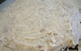 1.芋头去皮洗净,切成1厘米的薄片,放入耐热塑料袋中,加水,以高火蒸12分钟,取出趁热压成泥,并去除硬块。