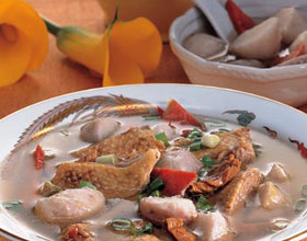 5.加入芋头块、鸭块及汤适量、糖10克、盐5克、陈皮(剁碎)10克,拌匀,覆盖,以强微波烹煮20分钟;