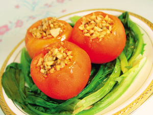 4.番茄洗净去皮,从根部挖出瓤,口朝上,码在油菜上;