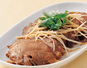 6.将口条切成薄片排叠盘中,浇上少许原卤汁即成。