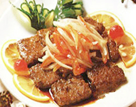 2.净锅烧热花生油,下牛柳肉块煎至两面呈金黄色,盛盘,伴以洗净的鲜番茄片、番茄酱、酱油少许即可上桌。