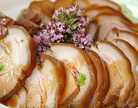 5.食用时解开棉绳,切片排入盘中,并撒上葱丝就可以了。