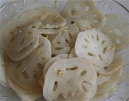 4.藕片加精盐、酱油、醋、味精拌匀盛入盘内,放上姜末;