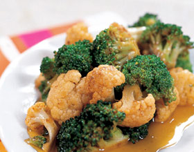 1.白、绿花椰菜洗净,切小朵,放入沸水中汆烫至熟,捞起沥干备用。