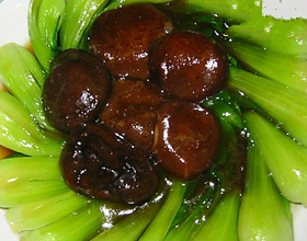14、将焖好的香菇勾薄芡出锅码放放在菜心上。