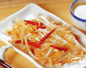1、圆白菜去掉老叶,洗净,切成细丝,用沸水烫一下,晾凉,挤去水分,放在盘内,用精盐拌匀。