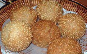 3.将藕茸粉团揪成面剂,擀成圆皮,包上豆沙,团成丸子形,外面滚上芝麻,做成豆沙藕丸生坯。