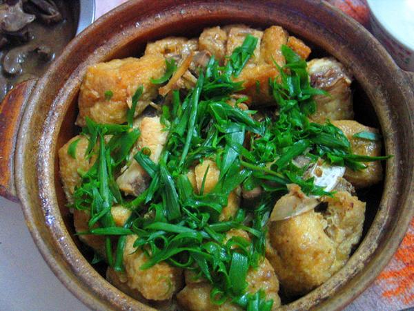 2、豆腐切成长厚片,用油煎黄盛出后,放入耐煮锅或沙锅内,面上放入煎好的鱼头。
