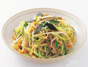 主料:黄豆芽200g﹐萝卜100g﹐胡萝卜1/2个﹐蕨菜50g﹐桔梗50g﹐梨1/2个﹐松子粉1大勺﹐辣椒丝少量佐料﹕蒜2块﹐芝麻1大勺﹐醋3大勺﹐白糖2大勺﹐辣椒面1大勺