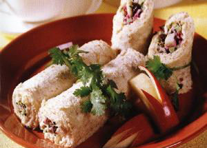 (6)取下保鲜膜,在土司卷的正中间繫上香菜即可。