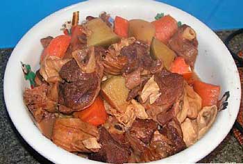 羊腩油炸至微焦。用生姜,料酒,元肉加水放炸过的羊腩并煮开。然后放南乳5-6块,用慢火煨2个小时左右,羊腩煮至微烂即可。枝竹和青/红罗卜在起锅前半个小时下。