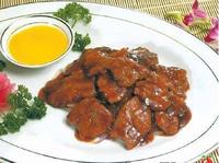 3、最后的工序是浇调味汁,调味汁很讲究,先用洋葱加黄油炒香,再加蒜茸炒香,然后喷葡萄酒,加牛肉汁和黑椒碎末,便大功告成了。