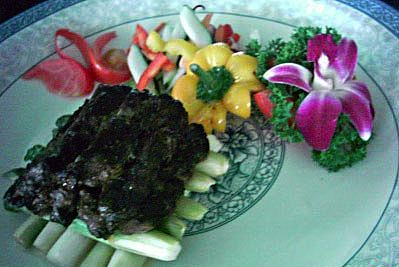 (3)根据肉的软硬状况来判断内部温度(嫩,五成,全熟等),配以胡椒汁;