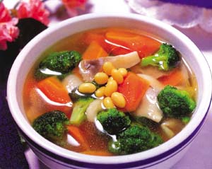 3.待红萝卜块煮烂时,下入泡透的黄豆、西兰花,调入盐、味精、白糖,煮透即可食用。