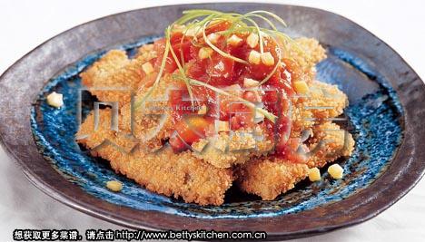 鳝鱼500g,面粉100g,面包糠100g,鸡蛋2枚,葱末1茶匙(5g),姜末1茶匙(5g),蒜末1茶匙(5g),番茄沙司2汤匙(30g),盐1茶匙(5g),白胡椒粉1/3茶匙(2g),白砂糖2茶匙(10g),油300ml(实耗20ml)