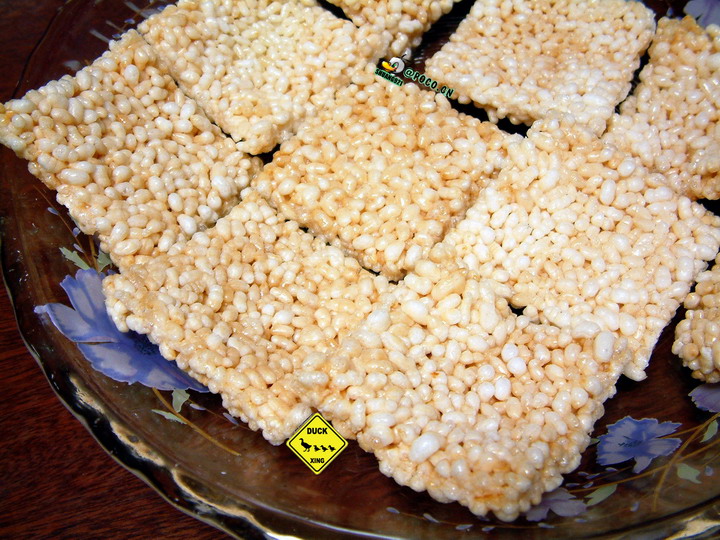 用微波炉刚制好的大片锅巴会稍稍有点软,切成小块炸后就变得松脆了。