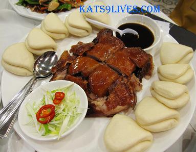 9、将鸭切成片,食用时同葱白段、甜面酱各少许,卷入鸭饼即可。