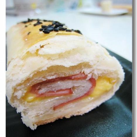 3、在长方形面皮上铺上奶酪片,再放火腿片(先煎好),再卷成长卷;