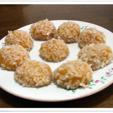4、将面团分割分别做成汤团,在糯米中打滚至均匀粘满米。(可在汤团中按自己的喜好包馅儿)