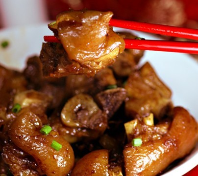 锅中留底油,放入蒜末、干葱煸炒出香味,加入南乳汁、柱侯酱、猪手、炸姜一起炒出香味,注入350ml高汤,煮滚后加入冰糖、1/2茶匙盐改小火加盖焖煮45分钟。