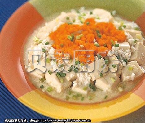 1、把豆腐切块,在加了盐的开水锅里焯一下捞起备用,红萝卜切丁、小葱切段备用;