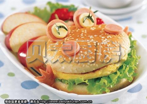 大嘴鳄的制作:粗火腿肠切下两个圆片,剩下的粗火腿肠对半分开,然后刻成2个小爪子形。细火腿肠切下两个薄厚一致的圆片。奶酪片切成2个小于粗火腿片的圆片。海苔剪成弯弯的眉毛形。将生菜叶和荷包蛋夹入汉堡胚中,然后在汉堡胚顶部靠后的位置一边戳个洞,接着将粗火腿圆片插入洞中,在火腿片的前边贴上圆奶酪片,奶酪片的上边再贴上眉毛。将细火腿肠圆片分别贴在汉堡胚前面的两侧,这样大嘴鳄的头部就做好了。